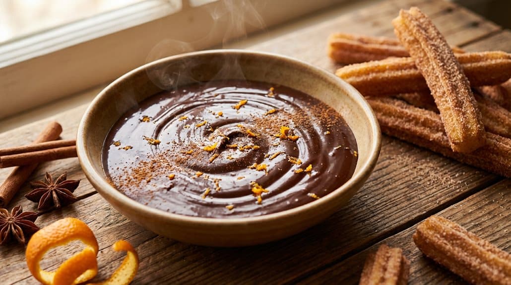 Wenn du in der Tiefkühlabteilung stehst und diese Tüten mit gefrorenen Churros anschaust, denkst du vielleicht, dass sie bestenfalls ganz okay werden, aber dieser Orangen-Zimt-Schokoladen-Dipändert alles. Ich hab die schon auf Partys serviert, wo niemand wusste, dass die Churros aus der Packung kamen, und ehrlich gesagt, hat es niemanden interessiert, sobald sie diese Schokolade mit Zitrus und Gewürzen probiert haben. Der Dip macht hier die ganze Arbeit. Du backst die Churros einfach nach Packungsanleitung, richtest sie auf einem Teller an und stellst eine Schüssel mit dieser warmen, glänzenden Sauce dazu. Plötzlich schmeckt dein praktischer Tiefkühlfund wie was aus einem schicken Dessert-Café.